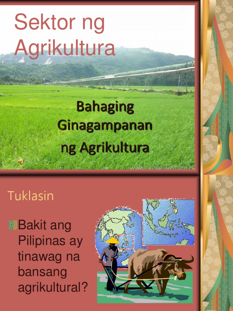 Dahil sa lawak at dami ng mga lupain napabilang ang Pilipinas sa mga bansang agrikultural dahil malaking bahagi nito ang ginagamit sa mga gawaing pang-agrikultura. 1 on a question. ANG SEKTOR AGRIKULTURA Humigit kumulang na 7100 isla ang bumubuo sa Pilipinas.