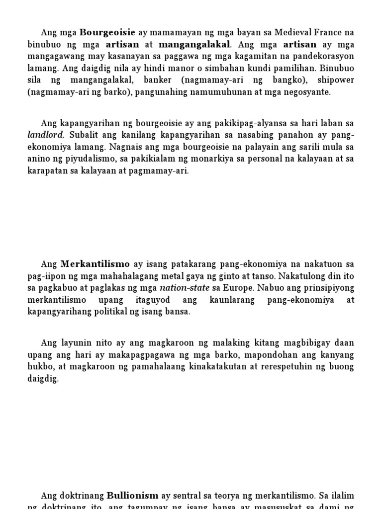 Isinusulong nito ang kaisipan na ang kapangyarihan ng isang bansa ay nakasalalay sa dami ng ginto at pilak dahil sa panahong iyon nakasalalay ang pamumuno at pagkakaroon ng kapangyarihan ng isang pinuno sa dami ng ginto at. Ang unang anyo ng sistemang pang-ekonomiya ay ang tradisyonal na ekonomiya. Alam ng lahat na sa simula ng ika-19 na siglo ang Russia ay nagsimulang mag-lago sa likuran ng Europa sa kaunlarang pang-ekonomiya at pampulitika.