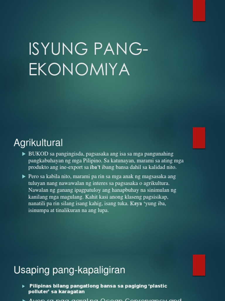 Itong presentasyon na ito ay tumatalakay sa mga isyung pang-ekonomiya sa Pilipinas at maging sa buong mundo. Talumpati Tungkol Sa Ekonomiya. Isyung pang- EKONOMIYA Agrikultural BUKOD sa pangingisda pagsasaka ang isa sa mga pangunahing pangkabuhayan ng mga Pilipino.